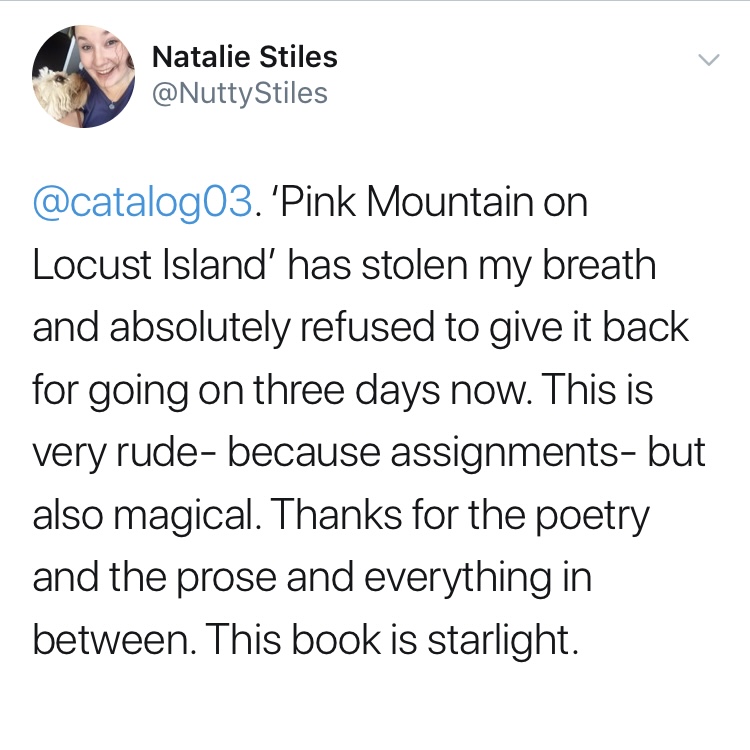 'Pink Mountain on Locust Island is written in prose that, like its fifteen year old protagonist, is surly, chaotic, compulsively attentive, and full of tender desperation.